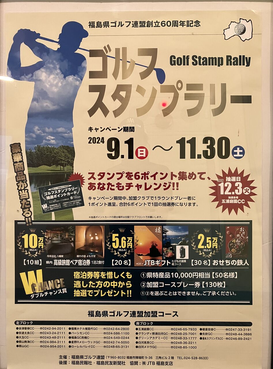 ゴルフスタンプラリー 2024年09月01日 本日よりゴルフスタンプラリーが始まりました~👍 スタンプを6ポイント集めてご応募ください! 詳細はこちらをご確認ください🙇 👇👇👇 < 前の記事次の記事 >